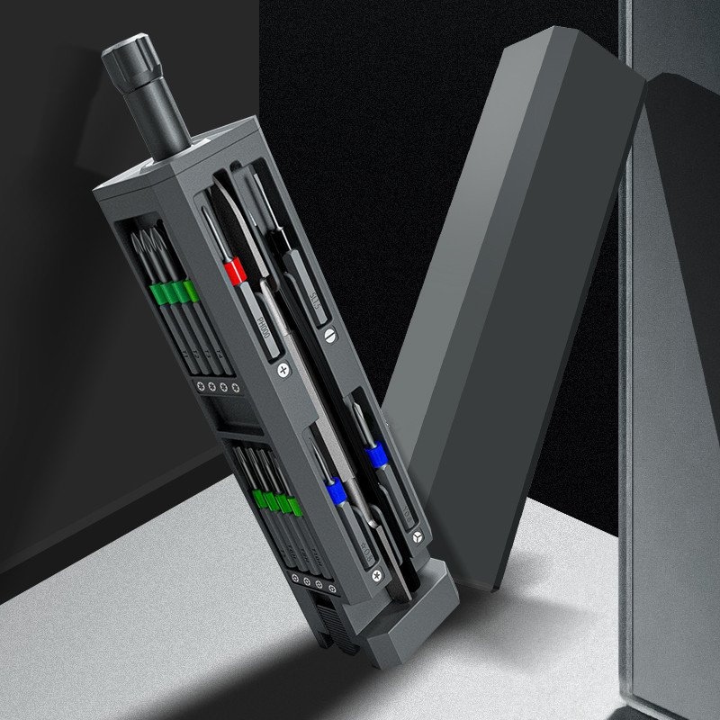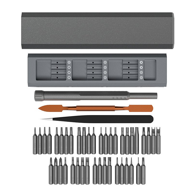 The set features an ergonomic aluminum alloy handle with a 360-degree rotating cap for effortless one-handed operation. Included in the kit are professional-grade accessories: a dual-ended metal spudger for prying open tight casings and anti-static tweezers for handling tiny, sensitive components. All tools are housed in a sleek, minimalist magnetic storage box that keeps every piece organized and secure. Its compact, pocket-sized design makes it the perfect portable companion for on-the-go repairs. Precision, durability, and style—all in one box.