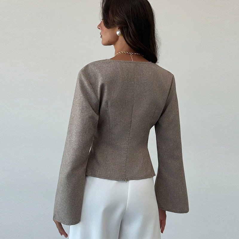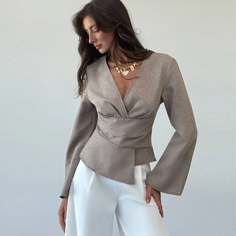 Define your sophisticated style with this elegant grey wrap-around top. Designed with a deep V-neckline and a unique pleated waist cincher, this blouse beautifully highlights the female silhouette while maintaining a professional and polished look. The long flare sleeves add a touch of dramatic flair and graceful movement, making it a perfect transition piece from office hours to evening gatherings. Crafted from a high-quality, breathable fabric with a subtle melange texture, it offers both comfort and a premium aesthetic. The asymmetrical hem and overlapping front design provide a contemporary edge that pairs effortlessly with high-waisted white trousers or sleek pencil skirts. Whether you are attending a business meeting or a chic brunch, this versatile top exudes confidence and modern femininity. Its timeless neutral tone ensures it will remain a centerpiece in your wardrobe for seasons to come.