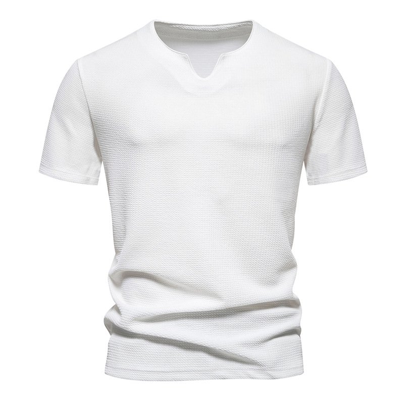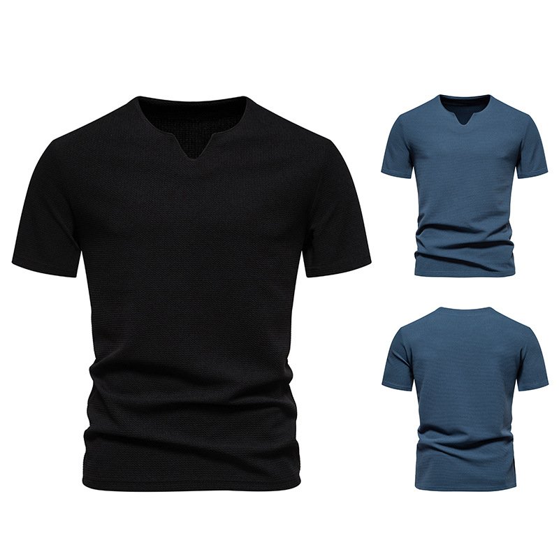 Upgrade your everyday essentials with this modern men’s waffle knit T-shirt. Designed with a unique notched V-neckline, this shirt offers a stylish departure from the standard crew neck, providing a more masculine and sophisticated edge. It is crafted from a premium cotton-blend waffle fabric, known for its breathable, moisture-wicking properties and distinctive honeycomb texture that adds depth to your look. The slim-fit tailoring ensures a clean, athletic silhouette that flatters the chest and shoulders while remaining comfortable for all-day wear. Available in versatile tones including deep blue, classic black, and crisp white, this tee is the perfect foundation for any outfit. Whether worn on its own with chinos for a smart-casual office look or layered under a light jacket for the weekend, this durable and soft-touch shirt combines effortless comfort with a refined urban aesthetic.